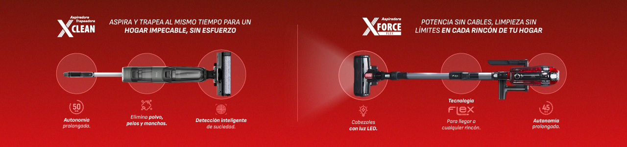 Las aspiradoras inalámbricas T-FAL -X-PERT 7.60, X-FORCE 9.60 y X-FORCE 12.60- combinan potencia, tecnología y versatilidad para transformar la limpieza del hogar. Su diseño ergonómico y sin cables permite moverse con total facilidad por cada espacio, mientras la tecnología Flex (solo en el rango X-FORCE) permite limpiar hasta 4 veces más lejos sin esfuerzo. Con cabezales iluminados, hasta 45 minutos de autonomía y más de 6 accesorios versátiles, las aspiradoras inalámbricas de T-FAL limpian pisos, muebles y rincones altos con gran eficiencia. Ideales para hogares con mascotas, eliminan fácilmente el polvo, los pelos y la suciedad del día a día. T-FAL lleva la limpieza al siguiente nivel: potente, práctica y sin complicaciones.